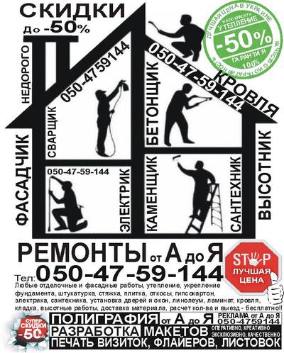 "Строители, ремонты от А до Я. Квалифицированные специалисты. Кровельщик, высотник, фасадчик, сантехник, электрик, каменщик, бетонщик, кладка печей, каминов, барбекю из кирпича, сварка, мебельщик, разнорабочий. В т.ч. аварийный вызов мастера (мастер на час), дизайнер интерьера, уборка квартир и домов, вывоз строймусора. Скидки на работы до 50%. Монтаж металочерепицы -40%(от 65грн), утепление фасада -50%(от 50грн), покраска - 50%(от 8грн), плитка - 30%(от 65грн), штукатурка -20% (от 35 грн), ремонты подъездов -50%, любая кровля - 30% и др. Тел: 050-47-59-144, 063-035-4528 При заказе на ремонтно-строительные работы - оказываем помощь по выбору стройматериалов с минимальными ценами, возможна доставка. Подсчет материала и составление сметы - в подарок К Вашим услугам готовы предложить . Изготовление мебели. Реставрация дверей. Уборка помещений. Скидки по ремонту подъездов! Работы по демонтажу. Новинка! Уничтожение плесени в квартирах! Безопасно, оперативно, недорого, без повреждения обрабатываемой поверхности. Гарантия 12 месяцев. Ремонти, будівельники від А до Я. Будматеріали за низькими цінами, доставка. Фасадчик, покрівельник, висотник, сантехнік, електрик, муляр, мебляр, бетонщик, зварювальник, разнорабочий, аварійний виклик майстра, майстер на годину, дизайнер інтер'єру, в т.ч. прибирання квартир і будинків. Низькі ціни. Знижки до 50%. Тел: 050-47-59-144 При замовленні на ремонтно-будівельні роботи - надаємо допомогу по вибору будматеріалів з мінімальними цінами, можлива доставка. Repairs, builders. Discounts up to 50%. Master on the hour from A to Z, inexpensive. Facade finisher, roofer, climber, plumber, electrician, bricklayer, furniture maker, mason, handyman, interior designer, including cleaning of apartments and houses. Low prices, quality and timely. Tel: +38 050-47-59-144 E-mail: 80504759144@mail.ru " |