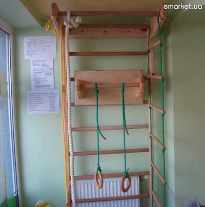 деревянная стенка высотой 210см с верхним турником стоит 890 грн. 1) спортивный уголок состоящий из стенки высотой 210см с верхним турником и веревочного комплекта (трапеция, кольца, канат морская лестница) 1240 грн. 2) спортивный уголок состоящий из стенки высотой 210см с верхним турником веревочного комплекта (трапеция, кольца, канат морская лестница), доски, навесного турника 1640грн.