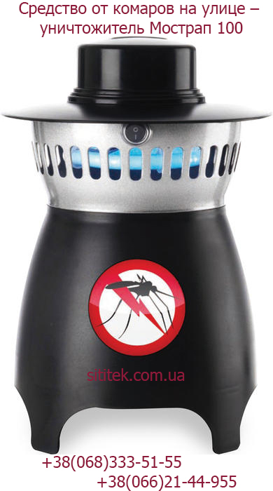 Мострап 100 – эффективное средство от комаров на улице. Считается профессиональным уничтожителем, так как его действие распространяется до 20 соток. Работает от сети 220 Вольт. Использует сложную систему приманивания, которая состоит из ультрафиолета, углекислого газа, тепла и октенола. Соответственно, имеет безотказную систему уничтожения, состоящую из мощного вентилятора, антимоскитного мешка, ловушки.