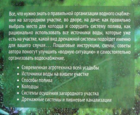 Все, что вам нужно знать о правильной организации водного снабжения на загородном участке, во дворе, на даче: как правильно выбрать место для колодца и соорудить систему полива, как рационально использовать все источники воды, которые уже есть на участке, какой вид дренажной системы подойдет именно для вашего случая… Пошаговые инструкции, схемы, советы автора помогут вам улучшить «водную ситуацию» во дворе и самостоятельно организовать водоснабжение всего поместья.